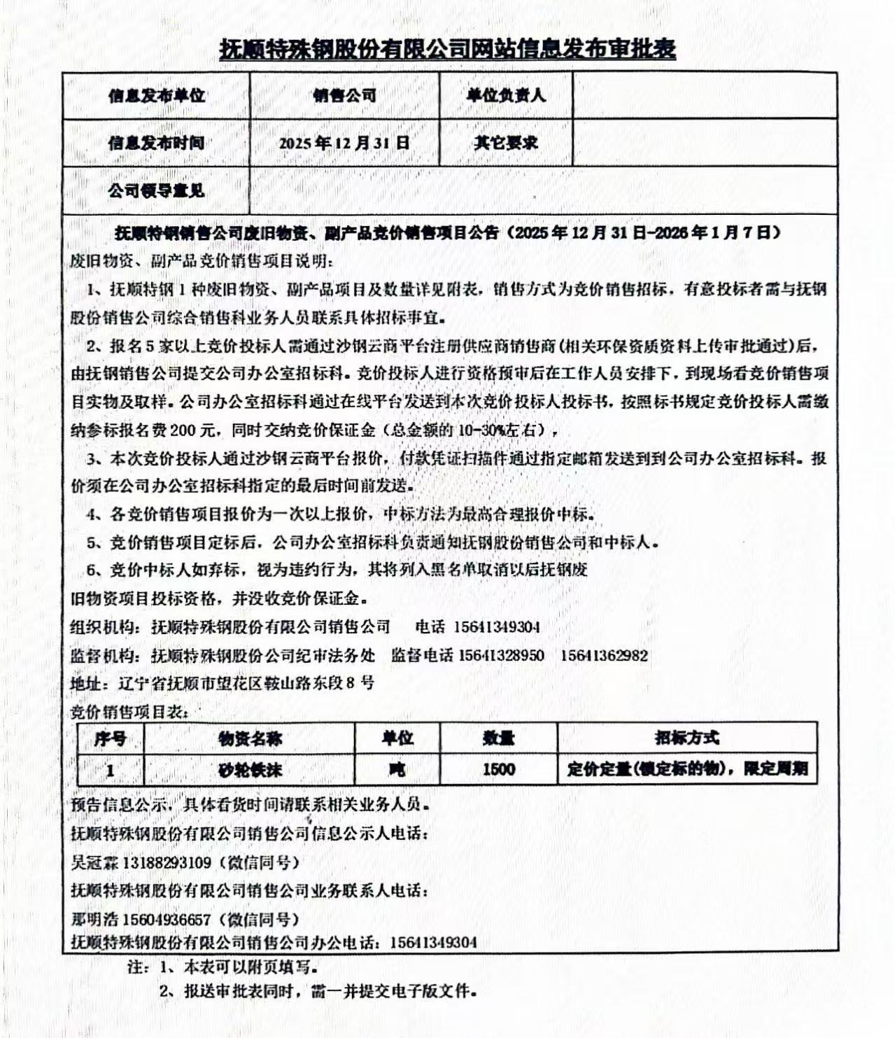 撫順特鋼銷(xiāo)售公司廢舊物資、副產(chǎn)品競(jìng)價(jià)銷(xiāo)售項(xiàng)目公告(12月31日-1月7日)